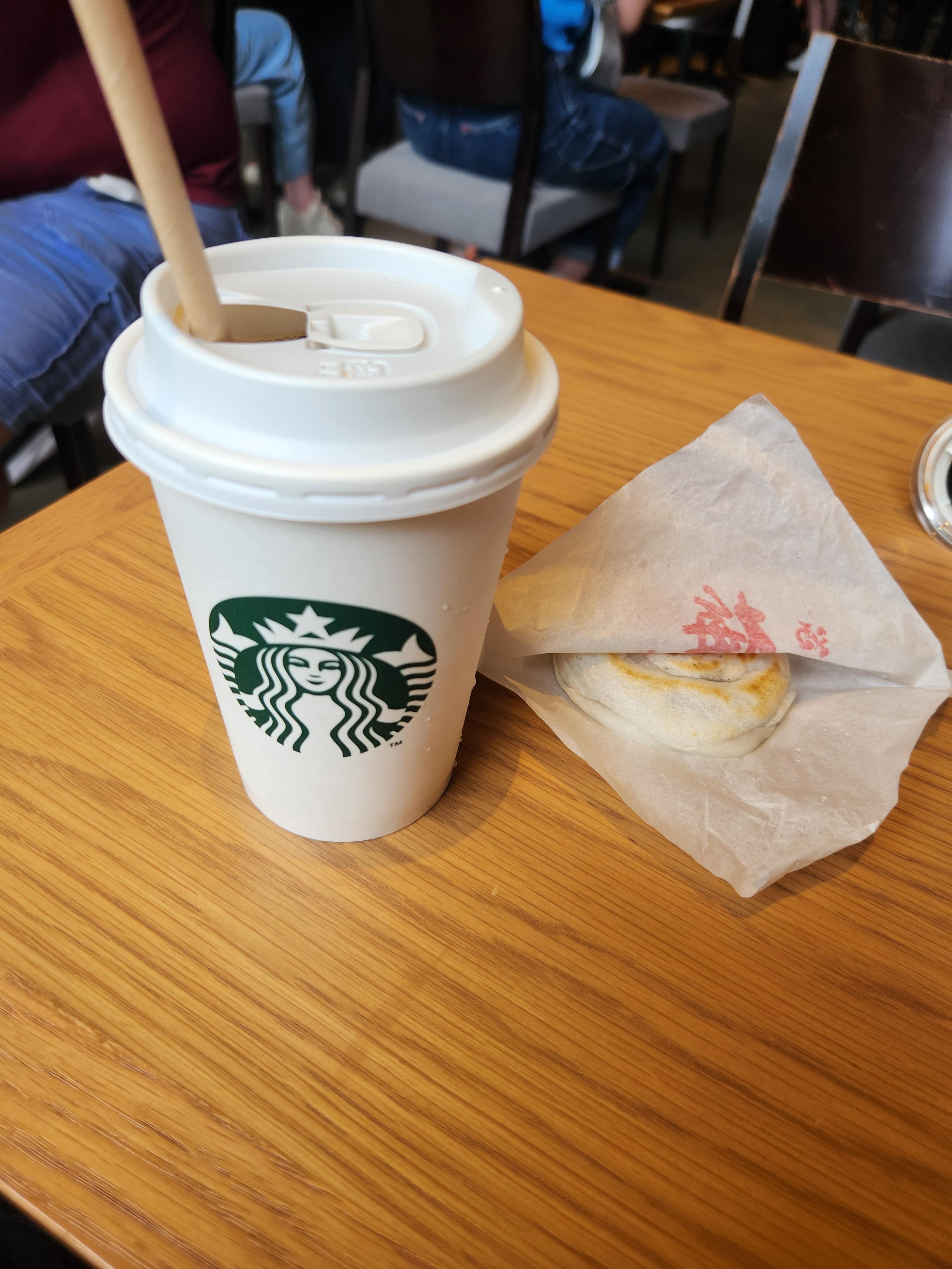 여기 스타벅스에서 아이스아메리카노 한잔과 옆가게에서 사 온 매화떡을 먹었습니다.